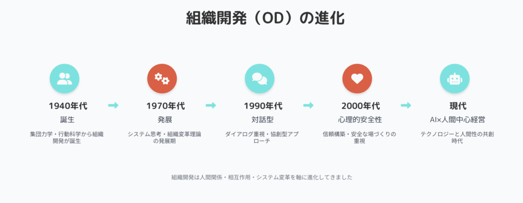 また、エンゲージメント・心理的安全性・ウェルビーイングといった概念が注目される中で、 組織開発は単なる効率化ではなく、人が生きがいを持って働ける場づくりとして再評価されています。