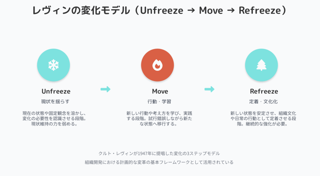 次に Move(移行) の段階では、対話と実験を通じて新しい行動パターンを試みます。 ここで大切なのは「完璧な計画」よりも「小さな学習」です。 そして最後に Refreeze(再凍結)。 成功した体験を定着させ、組織文化として共有します。 この3ステップは、80年経った今も変わらぬ変化の原則として多くの企業で引用されています。